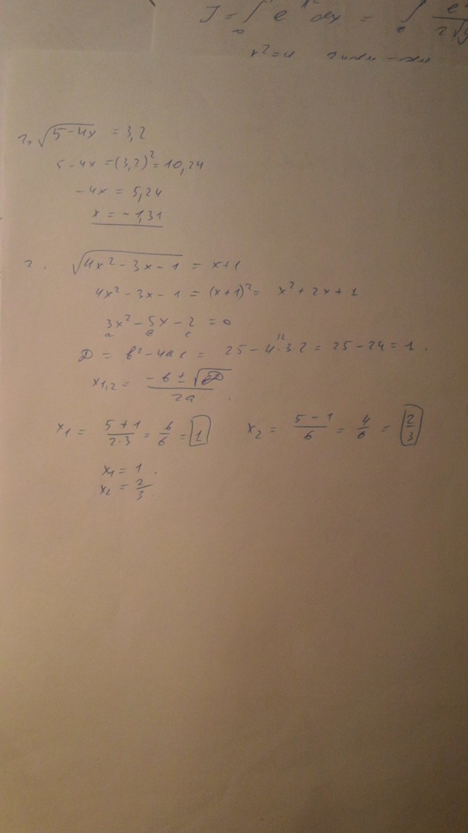 Возводим обе части в квадрат, получится: <br />5-4x=10.24<br />-4x=10.24-5<br />4x=-5.24<br />x=-5.24/4<br />x=-1.31<br /><br />2) [tex] sqrt{ 4x^{2}-3x-1 }=x+1](https://tex.z-dn.net/?f=+sqrt%7B5-4x%7D%3D3.2+%0A%D0%92%D0%BE%D0%B7%D0%B2%D0%BE%D0%B4%D0%B8%D0%BC+%D0%BE%D0%B1%D0%B5+%D1%87%D0%B0%D1%81%D1%82%D0%B8+%D0%B2+%D0%BA%D0%B2%D0%B0%D0%B4%D1%80%D0%B0%D1%82%2C+%D0%BF%D0%BE%D0%BB%D1%83%D1%87%D0%B8%D1%82%D1%81%D1%8F%3A%C2%A0%26lt%3Bbr+%2F%26gt%3B5-4x%3D10.24%26lt%3Bbr+%2F%26gt%3B-4x%3D10.24-5%26lt%3Bbr+%2F%26gt%3B4x%3D-5.24%26lt%3Bbr+%2F%26gt%3Bx%3D-5.24%2F4%26lt%3Bbr+%2F%26gt%3Bx%3D-1.31%26lt%3Bbr+%2F%26gt%3B%26lt%3Bbr+%2F%26gt%3B2%29%C2%A0%5Btex%5D+sqrt%7B+4x%5E%7B2%7D-3x-1+%7D%3Dx%2B1%0A)
