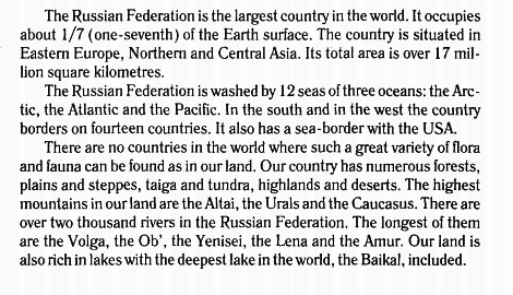 Российская Федерация самая большая страна в мире. Её площадь занимает 1/7 Земли. Страна расположилась на восточной Европе, Северной и Центральной Азии. Площадь страны примерно 17 миллионов квадратных километров.