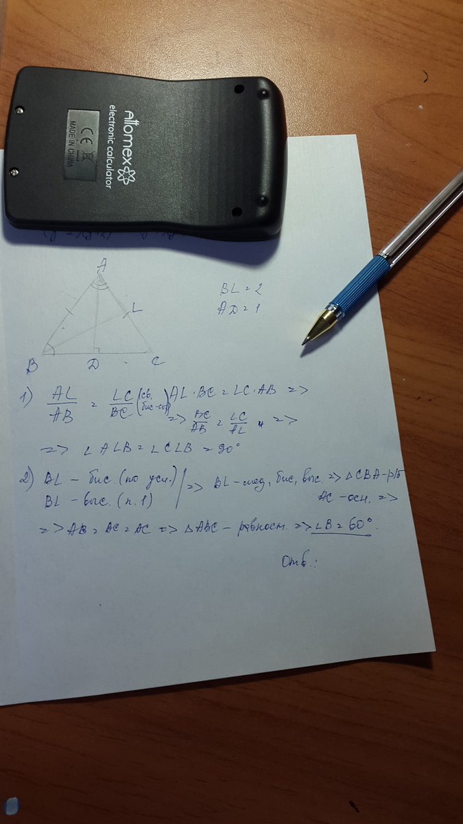 В равнобедренном треугольнике ABC с основанием BC биссектриса BL=2, а высота AD=1. Найдите угол ABC (в градусах)