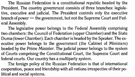 penMerah Россия является конституционная республика во главе с президентом. Правительство страны состоит из трех ветвей: законодательной, исполнительной и судебной. Президент контролирует лишь исполнительную Правительство, а не Верховный суд и ФРС ветви власти рального Собрания. Законодательная власть принадлежит Федеральному Собранию, состоящий из двух палат: Совета Федерации (верхняя палата) и Государственной Думы (нижняя палата). Каждая камера, возглавляемая Председателем. Исполнительная власть принадлежит правительству (Кабинету министров) во главе с премьер-министром. Судебная власть принадлежит к системе судов, входящих в Конституционный суд, Верховный суд и федеральные суды. Наша страна имеет многопартийную систему Внешняя политика Российской Федерации является то, что международное сотрудничество, мира и дружбы со всеми народами, независимо от их политических PO и социальных систем.