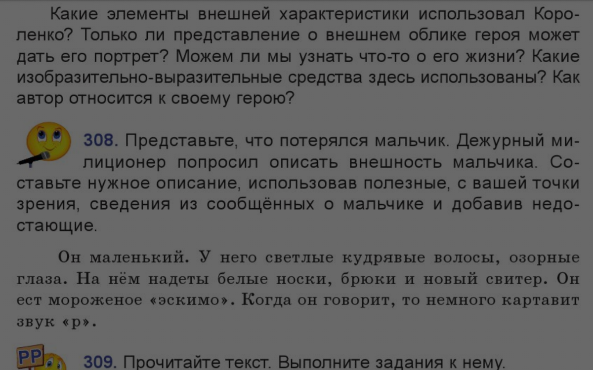 Мальчик очень маленький . У него были светлые и кудрявые волосы, у него озорные глаза . На нём надпты белые носки , чёрные брюки , и новый свитер . Он любит есть мороженое 《 эскимо》. Когда он разговаривает , то немного картавит звук 《 р 》