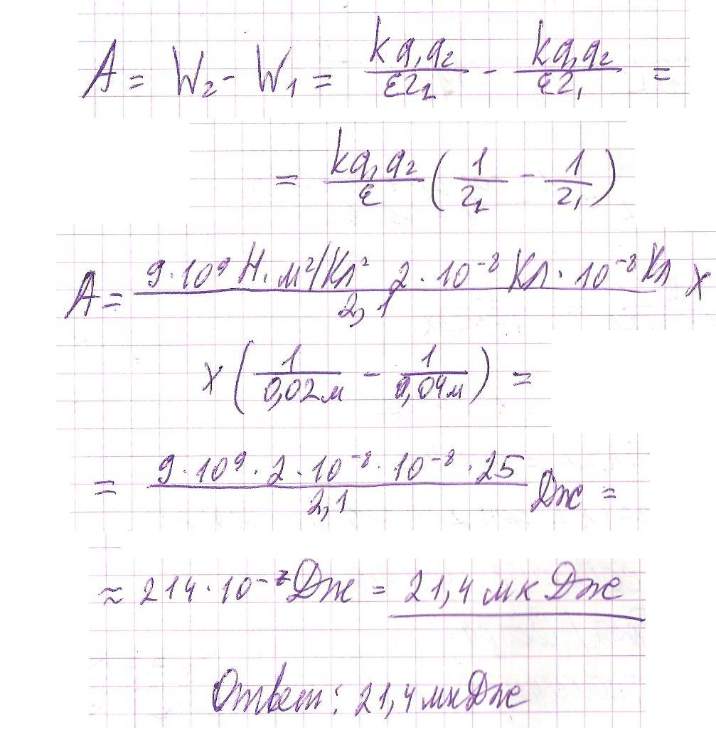 Точечные заряды q1 = 2 • 10^(-8) Кл и q2 = 10^(-8) Кл расположены в керосине ( ε = 2,1) на расстоянии г1 = 0,04 м друг от друга. Какую работу надо совершить, чтобы сблизить заряды до расстояния г2 = 0,02 м?