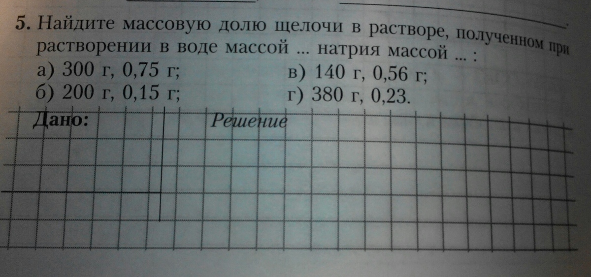 Найдите массовую долю щелочи в растворе, полученном при растворении в воде массой ... натрия массой ... :