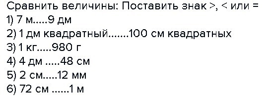 Сравни величины . Поставь знак больше, меньше или равно. 7 м 9 дм. , 1 дм. 100 см. 1 кг. 980 г , 4 дм. 48 см. , 2 см . , 72 см. 1 м.