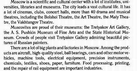 Москва - научный и культурный центр с большим количеством институтов, университетов, библиотек и музеев. Город ведет обширную культурную жизнь. В нем есть большое количество кинотеатров, клубов, концертных залов, более чем 40 драматических и музыкальных театров, включающие Большой Театр, Художественный театр, Малый Театр, Театр имени Вахтангова.