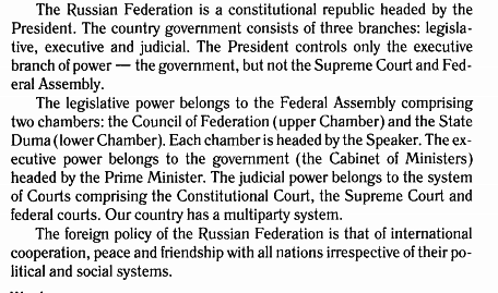 Россия является конституционной республикой во главе с президентом. Правительство страны состоит из трех ветвей: законодательной, исполнительной и судебной. Президент контролирует только исполнительную ветвь власти - правительство, но не Верховный суд и Федеральное Собрание.