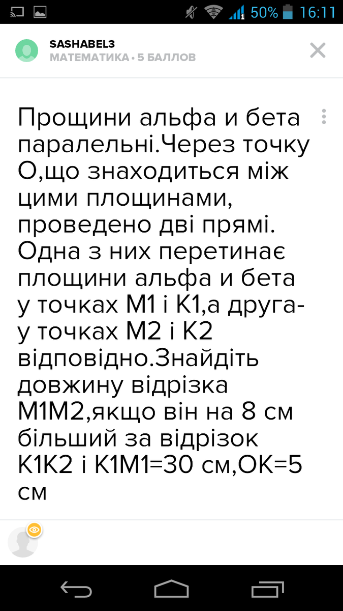 Значит из стереометрии тут нужно подчеркнуть только то , что две прямые пересекаются и образовывают плоскость ( по аксиоме стереометрии). Теперь у нас там нужно доказать что треугольники подобны. В данном случае по равенству углом : угол м1 и к1 как внутрішні різносторонні и тоже самое к2 и м2 - аналогічно ну и углы между прямыми м2ом1 и к1ок2 . Поэтому соотношение сторон: (не будут писать стороны сразу цифры)