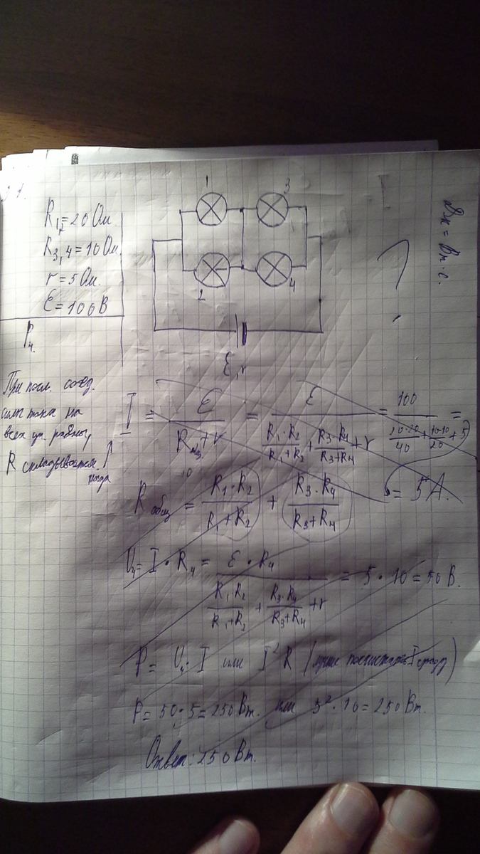 Какая мощность выделяется на лампе 4 в цепи, собранной по схеме, изображенной на фото? Сопротивление ламп 1 и 2 R1 = 20 Ом, ламп 3 и 4 R2 = 10 Ом. Внутреннее сопротивление источника r = 5 Ом, его ЭДС E = 100 В.