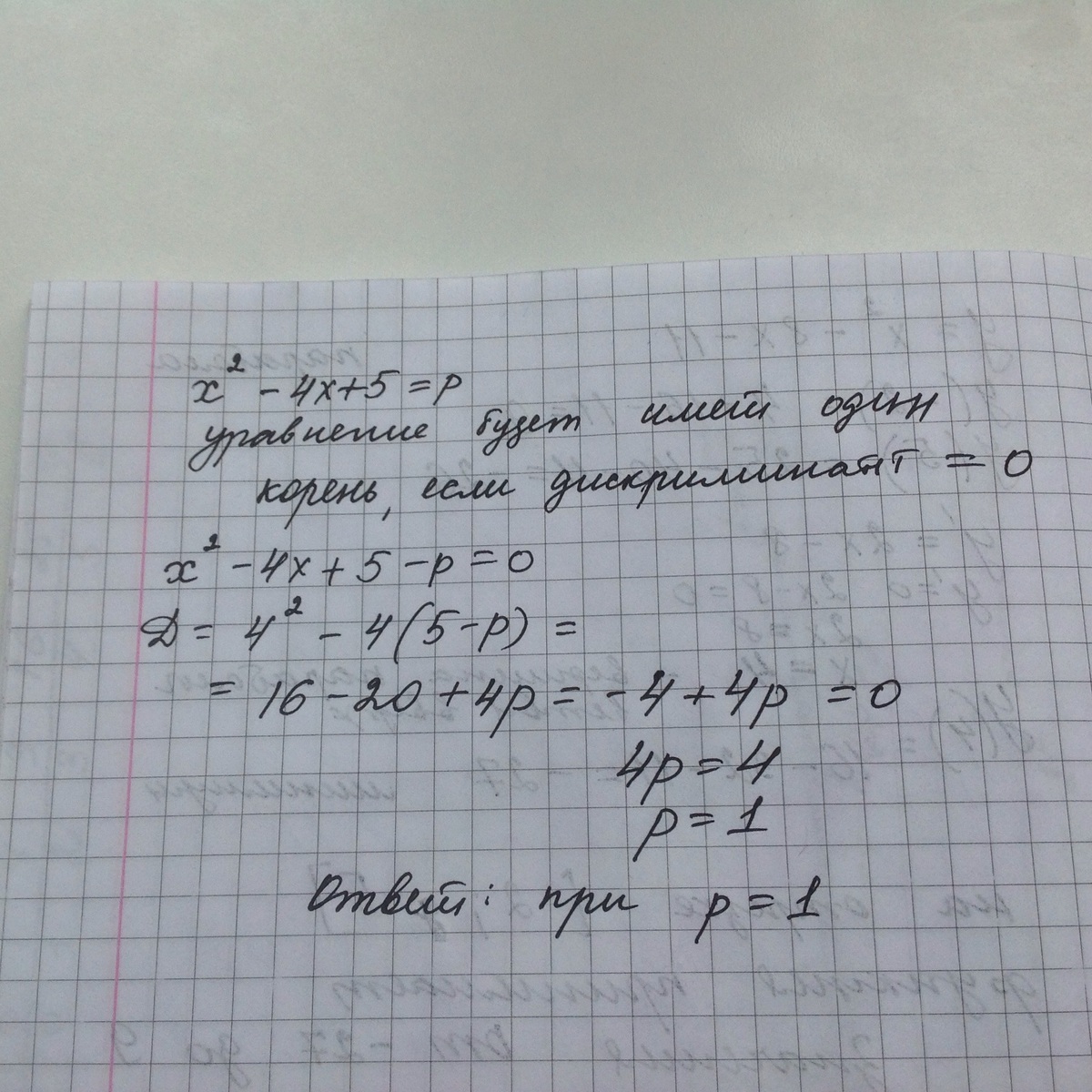 При каком значении p уравнении x^2-4x+5= p имеет один корень