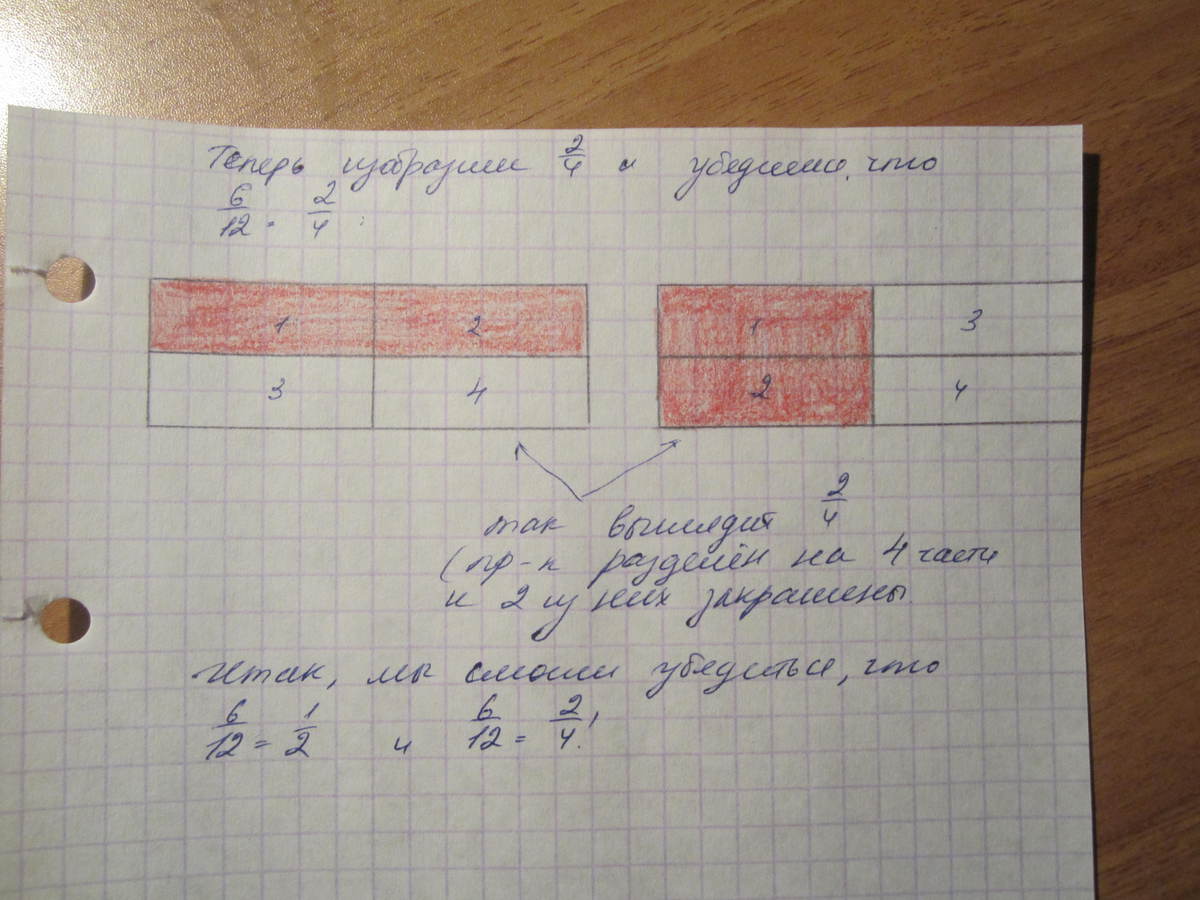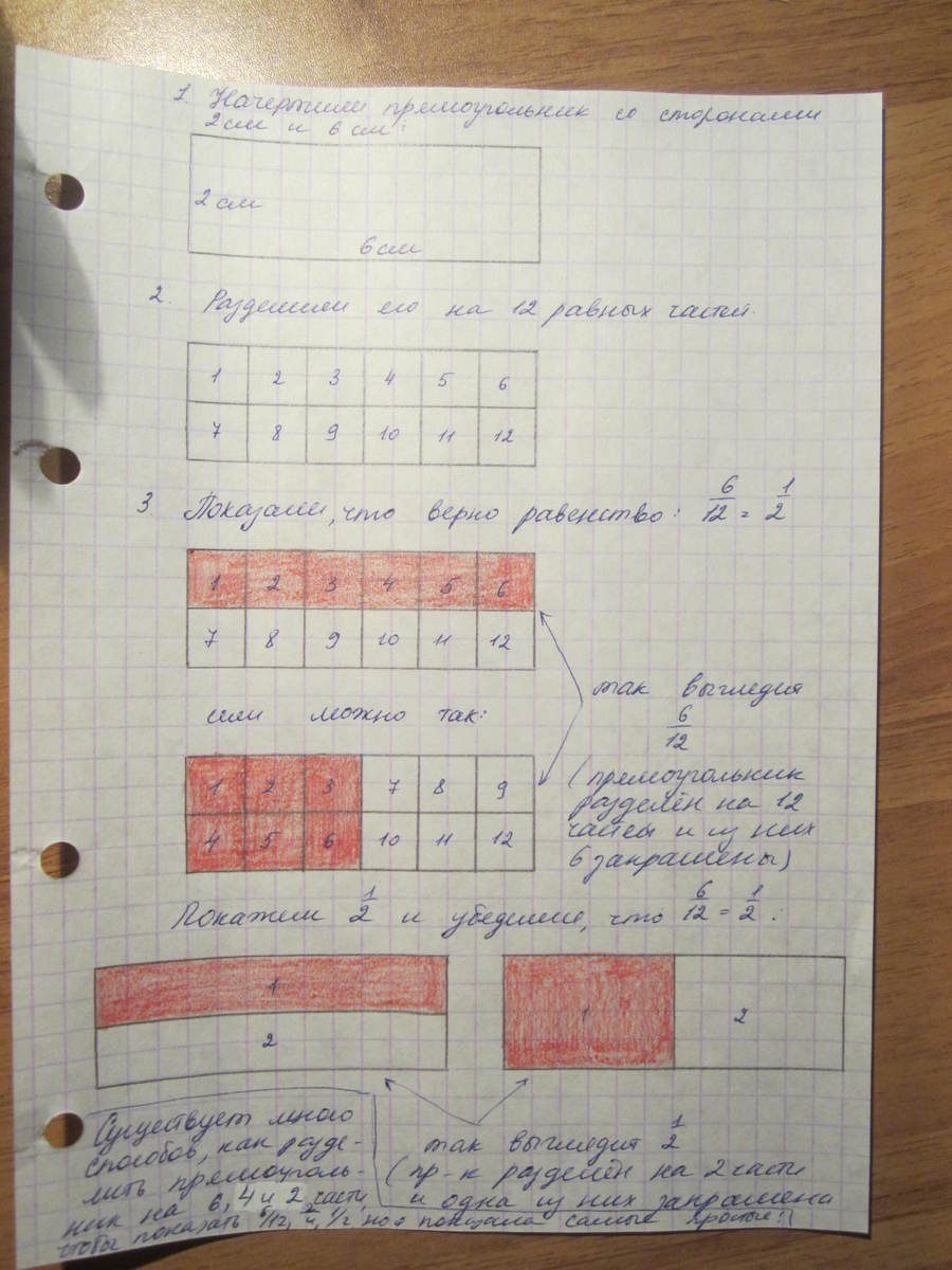 начертите в тетради прямоугольник со сторонами 2 см и 6 см', разделите его на 12 равных частей. покажите с помощью рисунка, что верно равенство:б)612=12 в)612=24