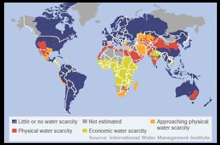 1) Where in the world are there great problems with water? Ответ смотрите на фото ниже (water scarcity - нехватка воды, красным и желто-зеленым показаны регионы, где не хватает воды)