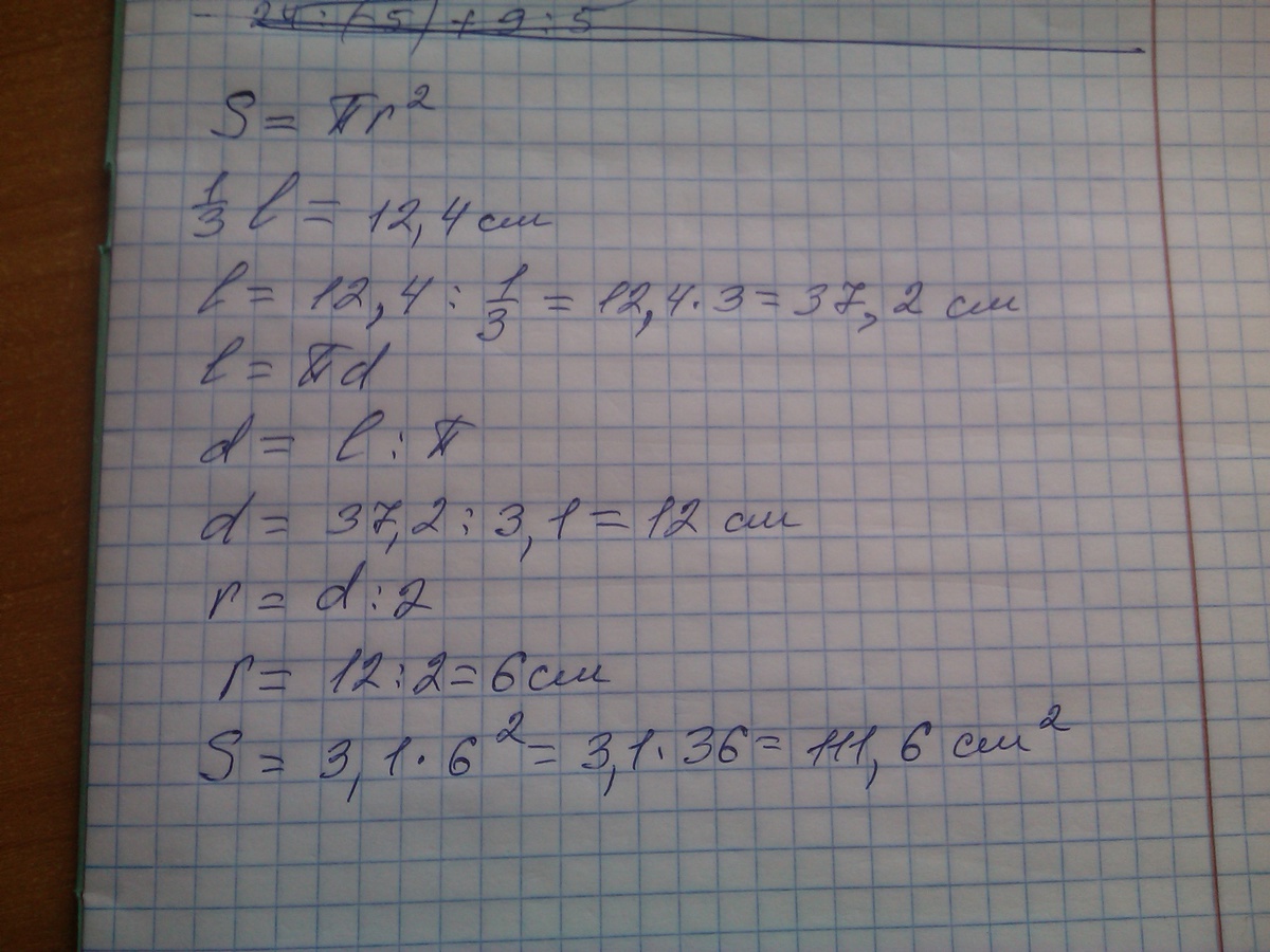 Найти площадь круга, если 1/3 длина окружности равна 12,4 см. Число "пи" округлите до десятых.