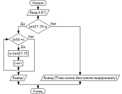 Запас рыбы в пруде оценен в А тонн. Ежегодный прирост рыбы составляет 15%. Ежегодный план отлова-В тонн. Наименьший запас рыбы составляет С тонн. Составьте блок схему алгоритма для подсчета количества лет, в течение которых можно выдерживать данный план
