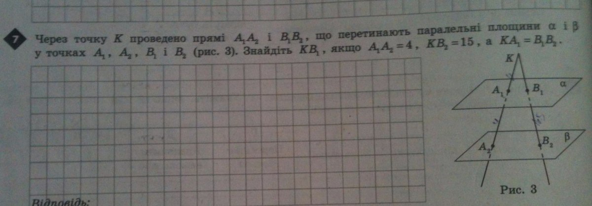 В этой задаче необходимо рассмотреть подобные треугольники А₁КВ₁ и А₂КВ₂. Они подобны по первому признаку подобия треугольников (по двум углам): угол К у них общий, а углы КА₁В₁ и КА₂В₂ равны, так как они соответственные, если плоскости параллельны ⇒ и отрезки принадлежащие этим плоскостям параллельны.