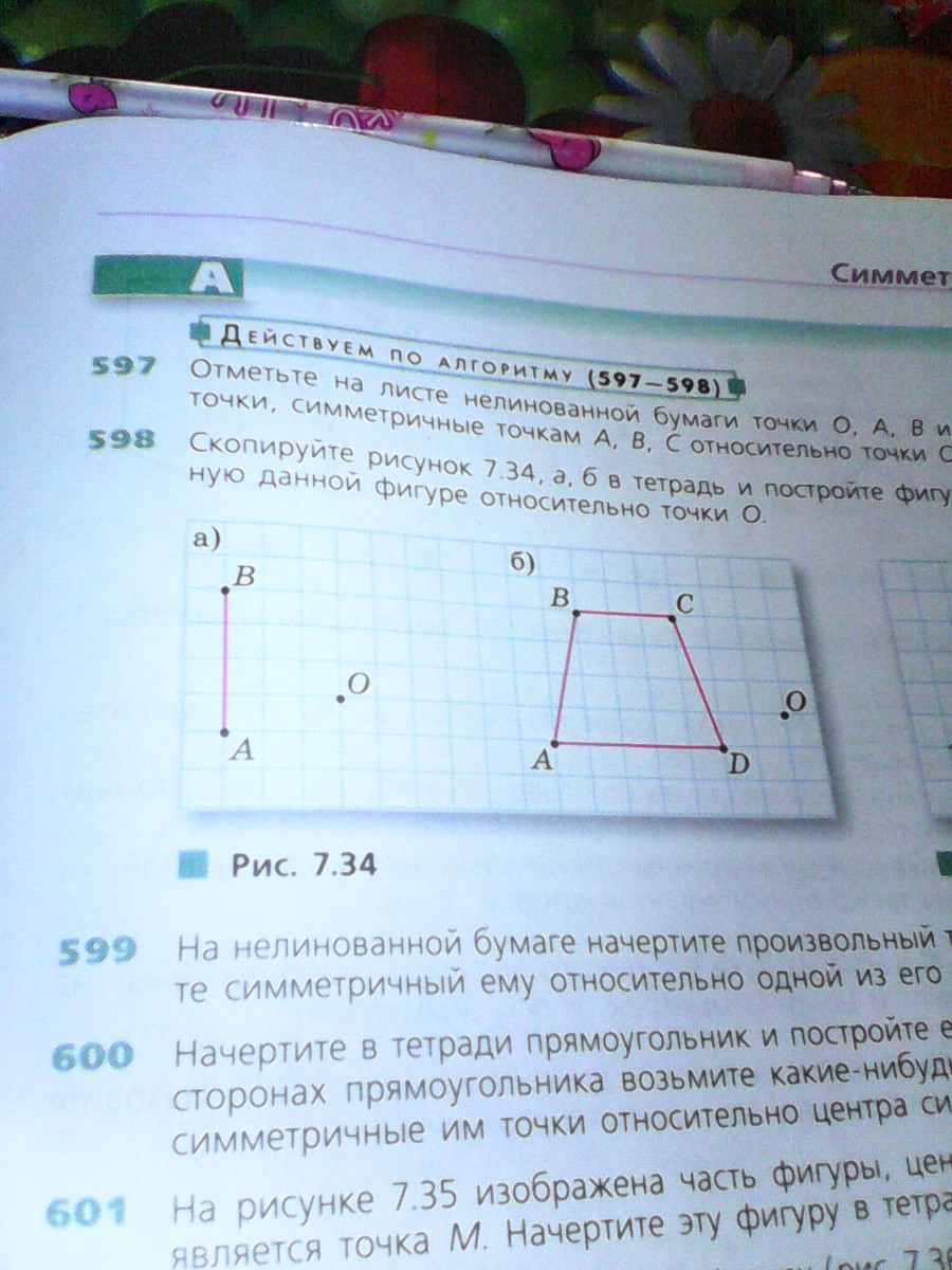 Скопируйте рисунок 7.34 а,б. В тетрадь и постройте фигуру симметричную данной фигуре относительно точке О. (Помогите пожалуйста)