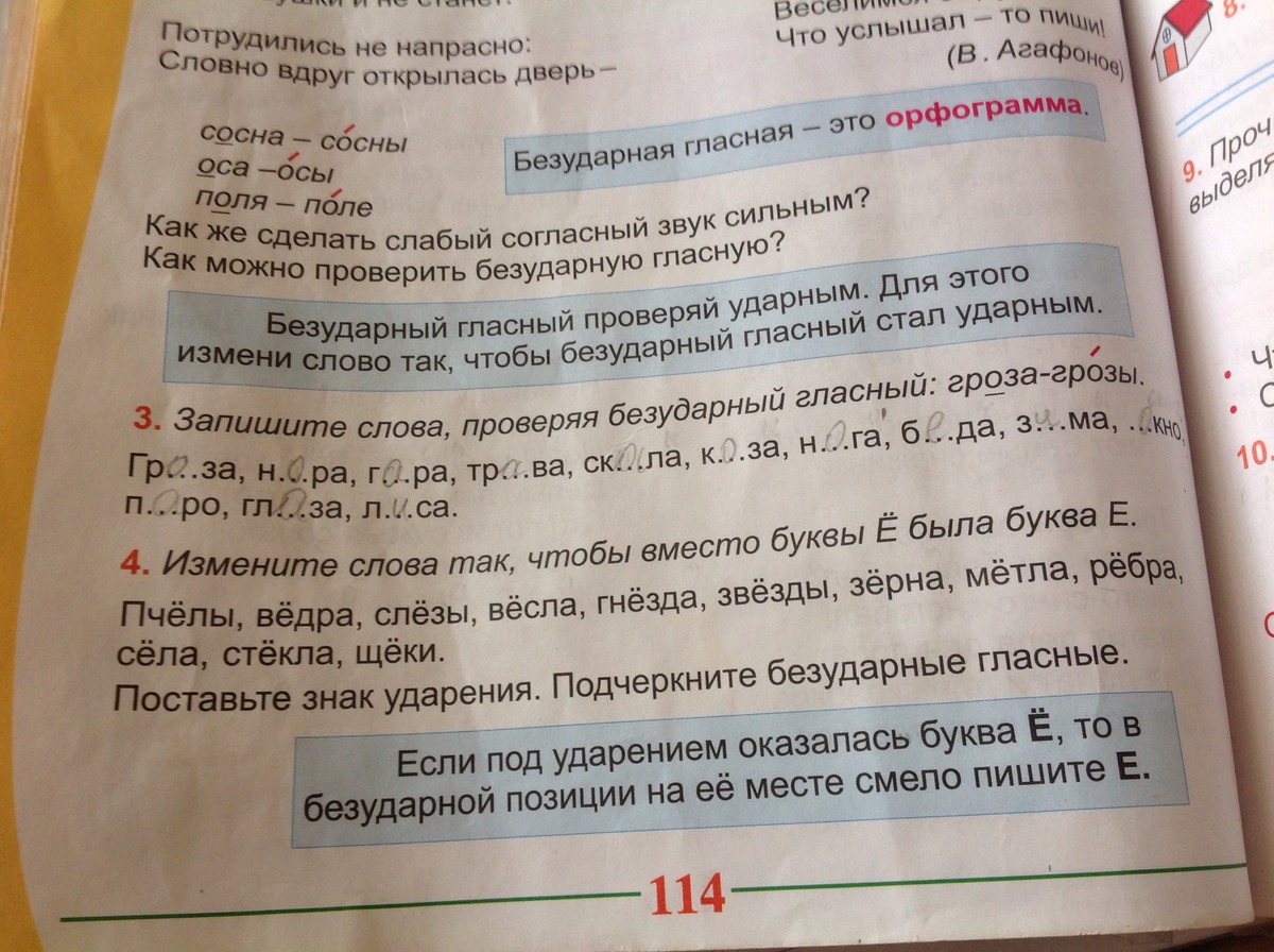 Измените слова так, чтобы вместо буквы Е была буква Е Пчелы, ведра, слезы, весла, гнезда, зерна, метла, ребра, села, стекла, , щеки. Поставьте знак ударения. Подчеркните бездарные гласные. Упражнение4.