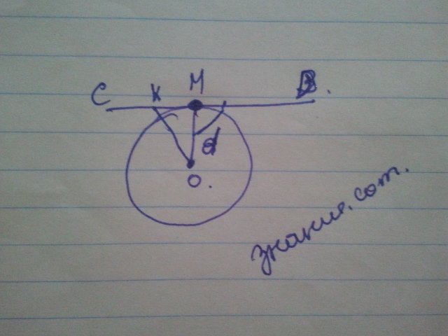 1.Если прямая СD касается окружности в точке М, то всякая другая точка прямой СD будет находиться вне круга, ограниченного этой окружностью, следовательно, расстояние от каждой точки прямой СD до центра, кроме точки М, будет больше расстояния ОМ — радиуса окружности. Значит, этот радиус есть наименьший из отрезков, соединяющих точку О с точками прямой СD, поэтому ОМ _|_ СD.