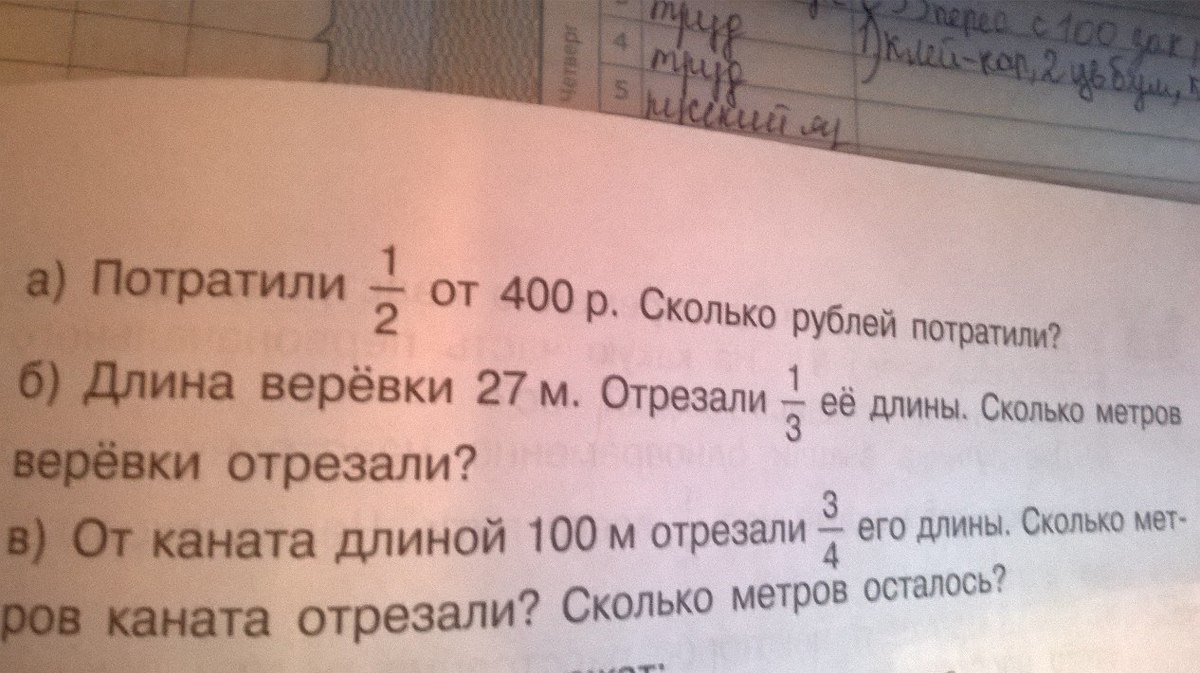в) 100*3/4=100*3:4=300:4=75(м)-каната отрезали