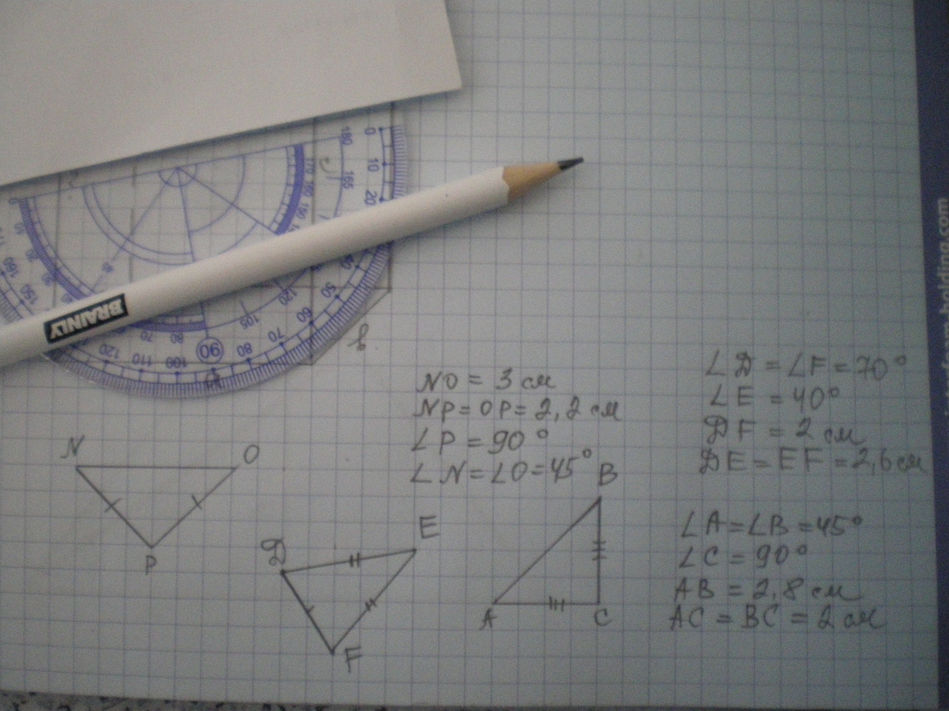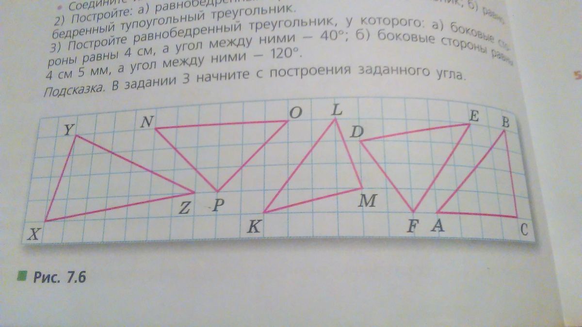 Найдите на рисунке 7.6 равнобедренные треугольники и скопируйте в тетрадь. Укажите боковые стороны и основание каждого из треугольников. Измерьте и запишите длины сторон И величины углов треугольника.