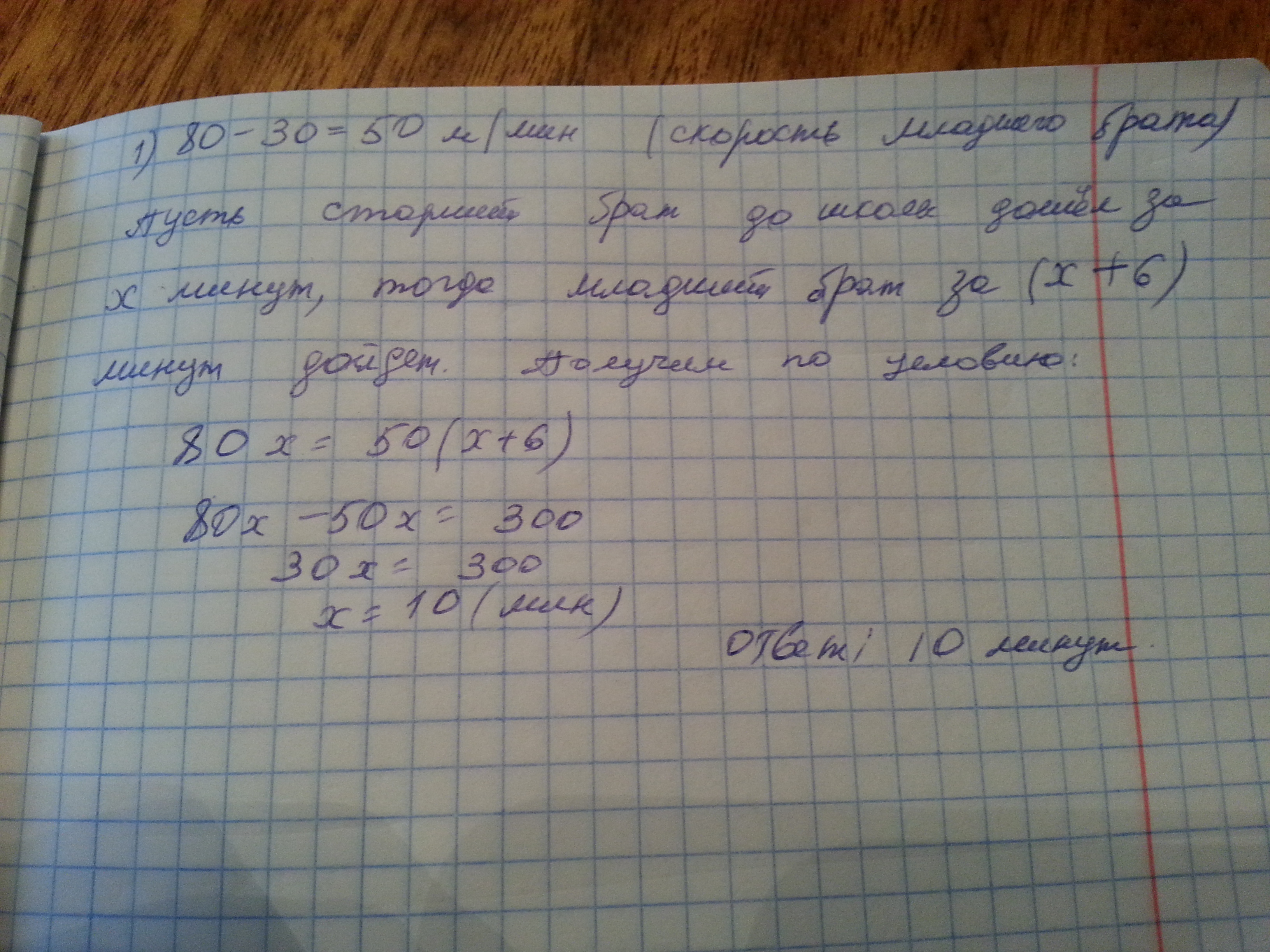 Два брата одновременно вышли из дома и направились в школу. Старший брат шел со скоростью 80м/мин. Младший брат со скоростью на 30м/мин меньше, чем скорость старшего брата, поэтому он пришел в школу на 6 минут позже. За сколько минут дошел до школы старший брат?