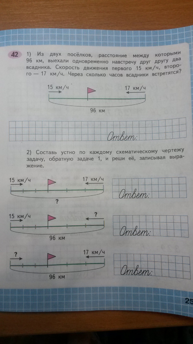 второй рис.после основной задачи:(96-15*3):3=17км/ч- скорость второго всадника