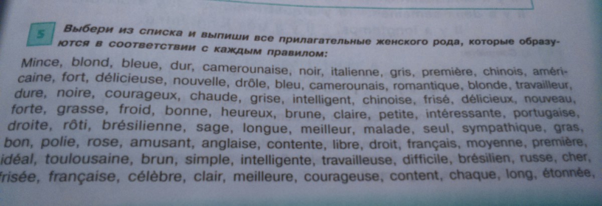 + слова: chaud, amusante, jaune,gauche, froide, poli,heureuse, petit , amusant, beige, commode, moyen, idéale, Ronde, marron rôtie, orange, toulousain, seule, anglais, chère,intéressant, portugais.