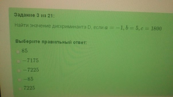 D = b² - 4ac = 25 - 4×(-1)×1800 = 25 + 7200 = 7225