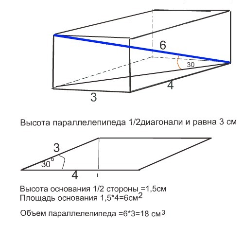 Найти объем параллепипеда если его основание имеет стороны 3 и 4 угол между ними равен 30 градусов а одна из диоганалей параллепипеда равна 6 см
