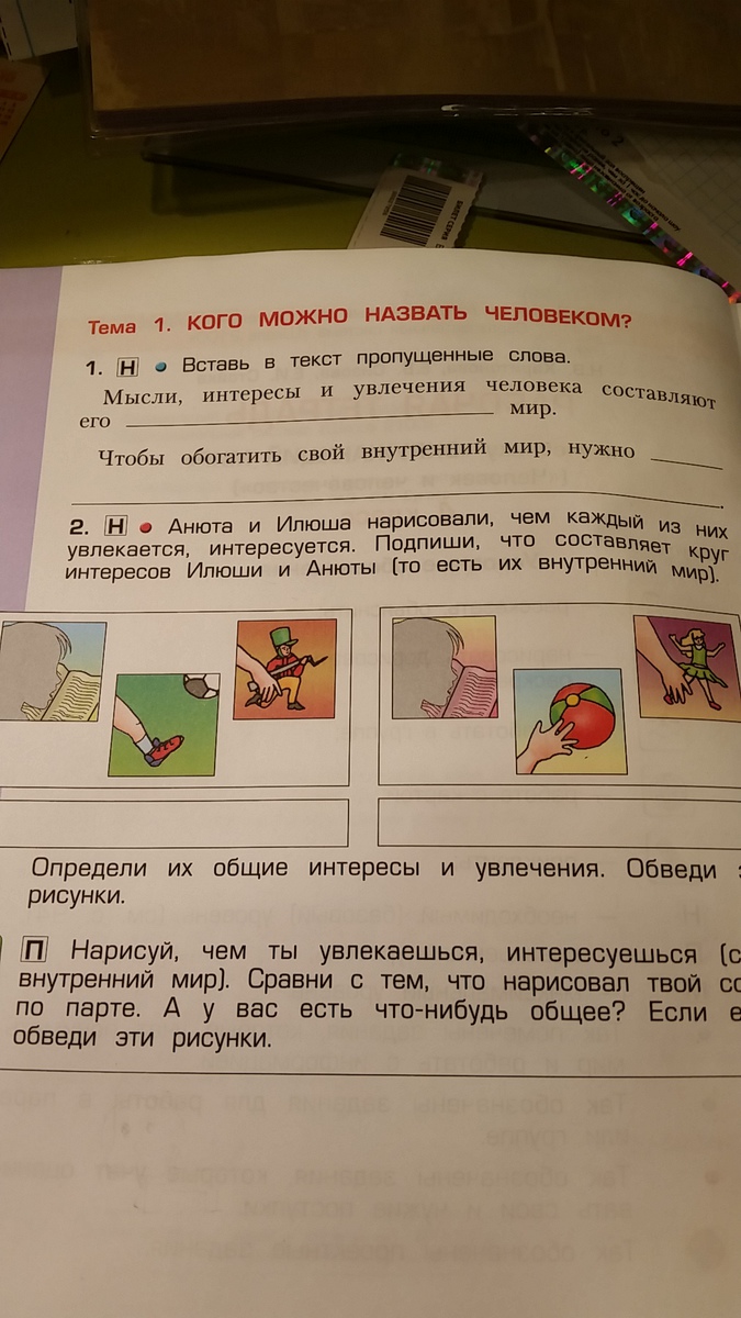Анюта и Илюша нарисовали , чем каждый из них увлекается , интересуется . Подпиши , что составляет круг интересов Илюши и Анюты ( то есть их внутренний мир )