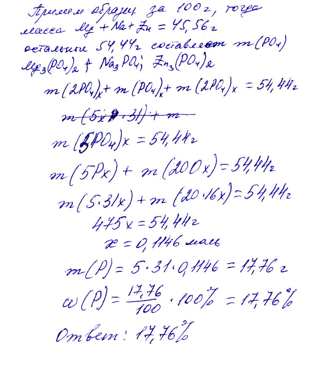 Массовая часть металлических элементов в смеси магний ортофосфату, натрий фосфату и цинк ортофосфату становит 45,56%. Расчитать массовую часть Фосфора в смеси.