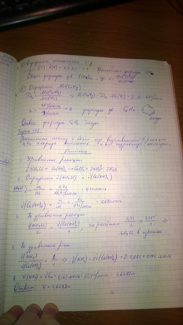 2. Вычислительной массу и объём образовавшегося газа в реакции 11,7 хлорида аммония и 6 г гидроксида кальция. (Ответ: 2,76 г и 3,63 л)