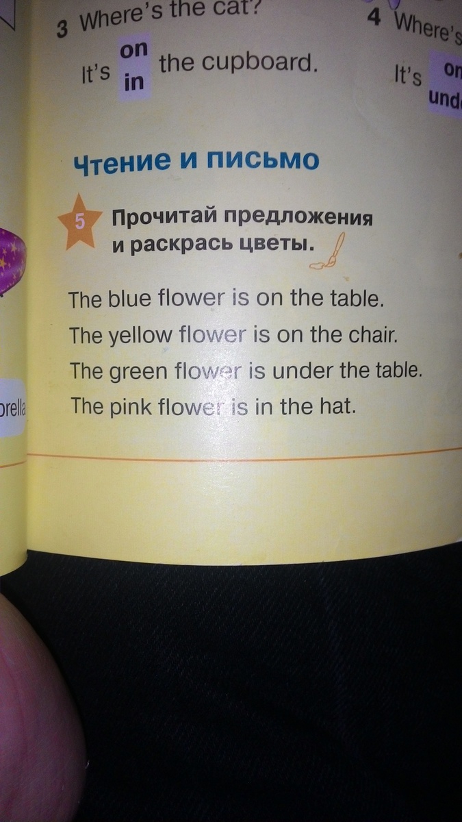 Голубой на столе; Желтый на стуле; Зеленый под столом; Розовый в шапке;
