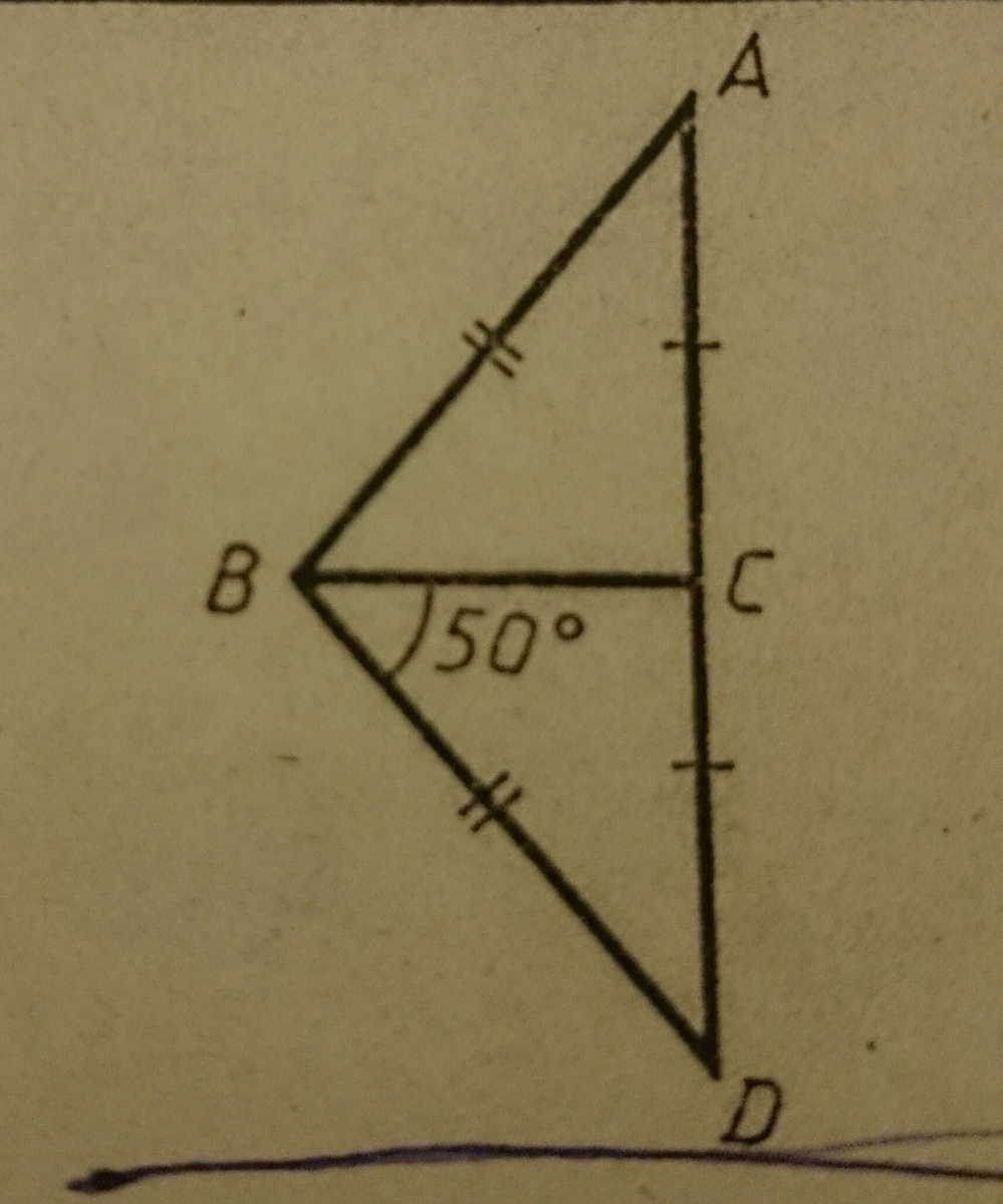 Надо всего лиш доказать что ΔДВС=ΔСВА. Сторона ВА=ДВ, ДС=СА, ВС - общая. За тремя сторонами треугольник ΔДВС=ΔСВА. А ещё ΔДВА равнобедренный потому что сторона ВА=ДВ, а ∠Д=∠А. Тогда ∠В=50°×2(Потому, что Бесектриса, медиана и высота в одном коктеле). Тогда ∠В=100° (∠ДВА=100°). А ещё на всякий случай ВС⊥ДА, то есть ∠ВСА=∠ВСД=90°.