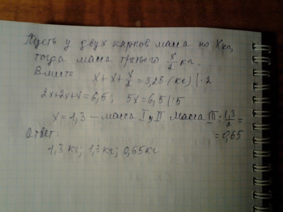 Олег упіймав трьох коропів, загальна маса яких 3 кг 250 г. Два коропи були однакові, а маса третього становила половину маси другого. Знайти масу кожного коропа.