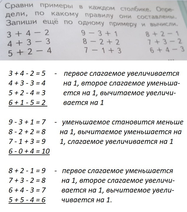 Сравни примеры в каждом столбике . Определи по какому правилу они составлены. Запиши ещё по одному примеру и вычисли 3+4-2 4+3-3 5+2-4