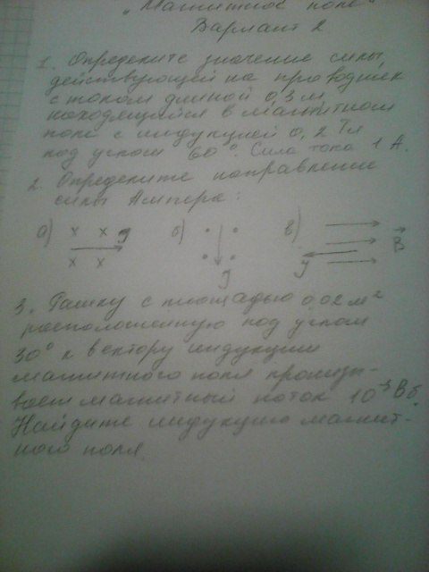 №2)а) вверх (если смотреть в плоскости рисунка, если перпендикулярно рисунку, то отнас: левую руку расположите так, чтобы острие карандаша (вектор магнитной индукции) входил в ладонь левой руки и направьте 4 пальца по току, отогнутый на 90 градусов большой палец покажет направление силы Ампера, крестики на рисунке означают то, что вектор В направлен за плоскость рисунка, т.е. от нас)