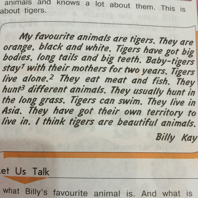 Перевод текста на русский:Мои любимые животные тигры. Они оранжевые, черный и белый. Тигры получили большие тела, длинные хвосты и большие зубы. Baby-тигры остаются со своими матерями в течение двух лет. Тигры живут в одиночестве 2 Они едят мясо и рыбу. Они Hunta различных животных. Они, как правило, охотятся в высокой траве. Тигры могут плавать. Они живут в Азии. Они получили свою собственную территорию, чтобы жить в. Думаю тигры красивые животные. Билли Кэй