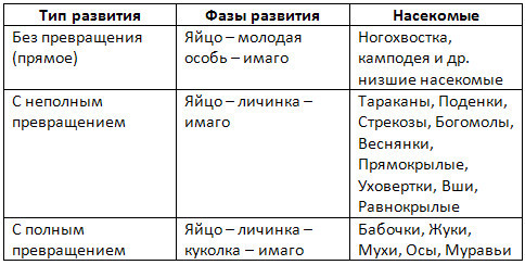 Таблица "Циклы развития насекомых"