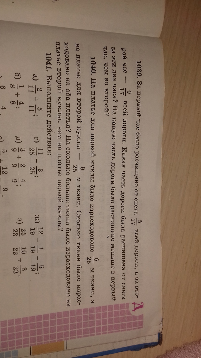 2) 9/25-6/25= 3/25(м)- на платье второй куклы пошла на 3/25 метра ткани больше, чем на платье первой куклы.