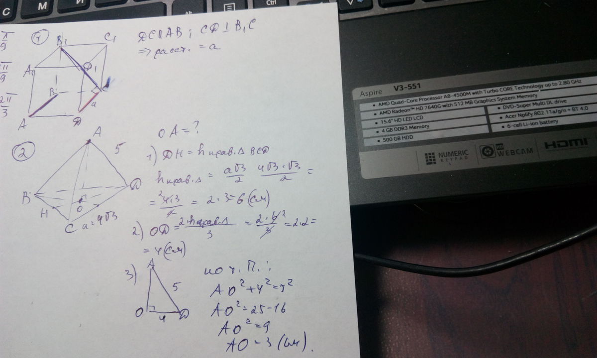 2.точка А находится на расстоянии 5 см от всех вершин равностороннего треугольника со стороной 4√3 см. Найдите расстояние от точки А до плоскости этого треугольника