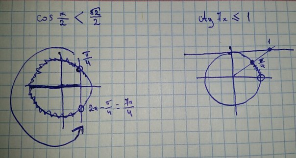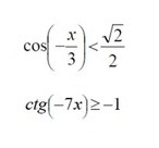 cos(-frac{x}{3})  textless   frac{sqrt2}{2}\cosfrac{x}{3}  textless   frac{sqrt2}{2}\frac{pi}{4}+2pi n textless  frac{x}{3} textless  frac{7pi}{4}+2pi n\frac{3pi}{4}+6pi n textless  x textless  frac{21pi}{4}+6pi n, ; nin Z;\\ctg(-7x) geq -1\-ctg7x geq -1\ctg7x leq 1\pi n leq 7x leq frac{pi}{4}+pi n\frac{pi n}{7} leq x leq frac{pi}{28}+frac{pi n}{7}