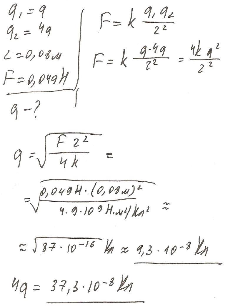 Два точечных заряда, из которых один вчетверо больше другого, в воздухе на расстоянии 8 см друг от друга взаимодействуют с силой 0.049 Н. Какова величина каждого заряда?