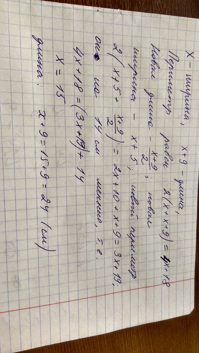 Решите задачу ,составив линейное уравнение: ширина прямоугольника на 9 см меньше его длины. Если его длину уменьшить в 2 раза ,а ширину увеличить на 5 см, то его периметр уменьшится на 14 см .Найдите длину данного прямоугольника.