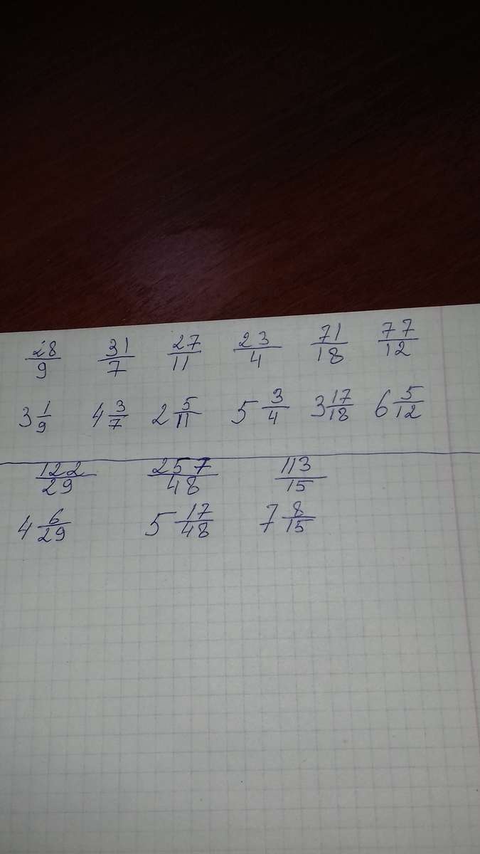 31/7=4 3/7; 2 5/11=27/5; 23/4=5 3/4; 3 17/18=71/18; 77/12=6 5/12; 4 6/29=122/29; 257/48=5 17/48; 7 8/15=113/15.