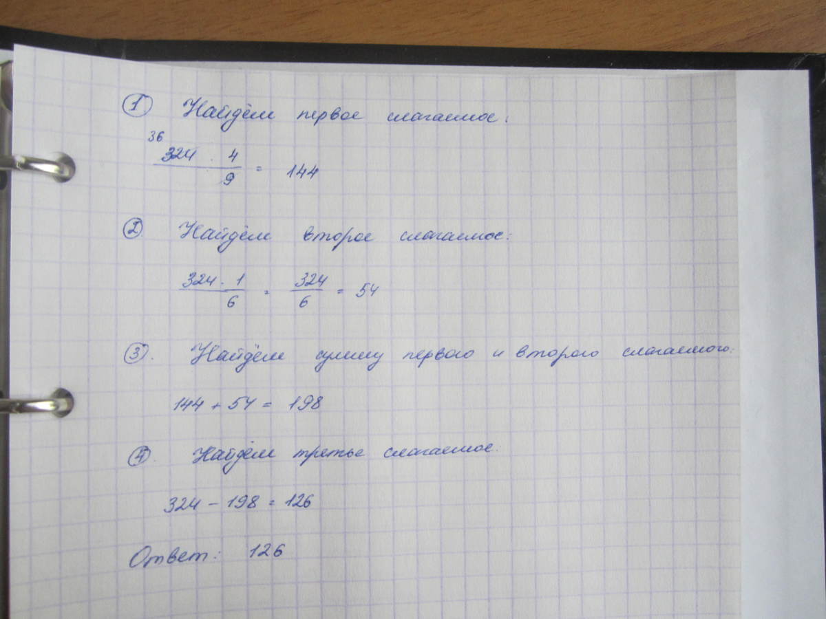 сумма трех чисел равна 324. первое слагаемое равно 4/9 суммы, второе 1/6 суммы. найдите третье слагаемое.