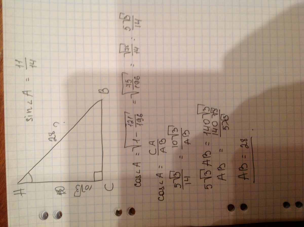 в треугольнике АВС угол С равен 90 градусов, SinА=11/14, AC=10 корней из 3.Найти АВ. пожалуйста подробно напишите, я прошу.