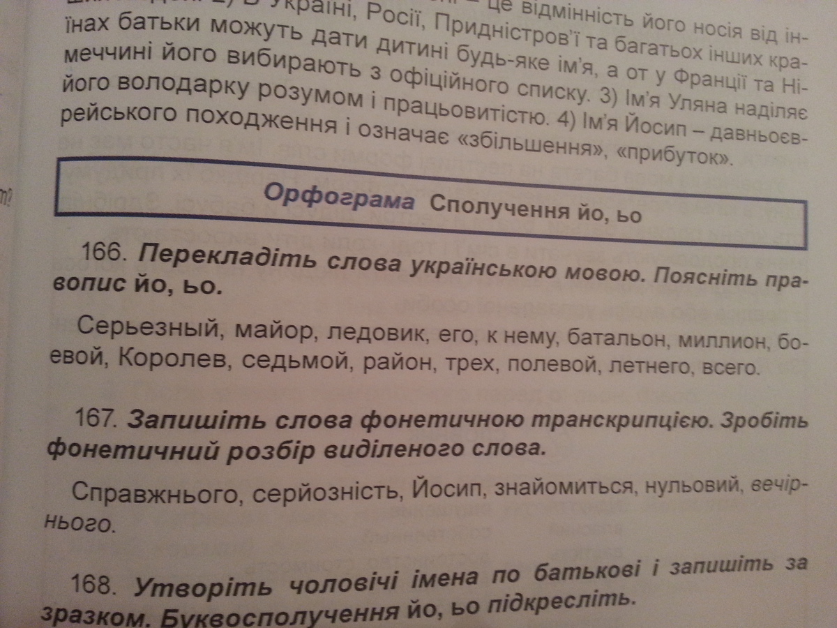 Помогите с заданиями : Перекладiть слова украiнською мовою. Пояснiть правопис йо, ьо.166,