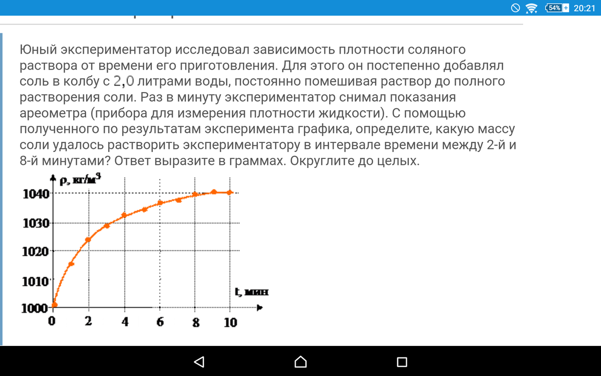 Юный экспериментатор исследовал зависимость плотности соляного раствора от времени его приготовления. Для этого он постепенно добавлял соль в колбу с 0,2 литрами воды, постоянно помешивая раствор до полного растворения соли. Раз в минуту экспериментатор снимал показания ареометра (прибора для измерения плотности жидкости). С помощью полученного по результатам эксперимента графика, определите, какую массу соли удалось растворить экспериментатору в интервале времени между 2-й и 8-й минутами? Ответ выразите в граммах. Округлите до целых.
