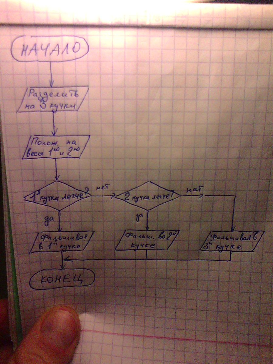 3)Положить 3 кучу на весы ,если одна из куч легче остальных значит фальшивая монета в ней