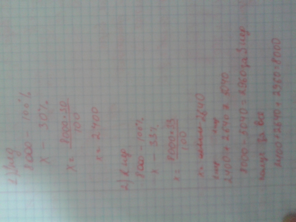 3. За три недели обувная фабрика выпустила 8000 пар обуви. За 1-ю неделю было выпущено 30 пр. (процентов) продукции, за вторую- 33 пр. продукции. Сколько пар обуви фабрика выпускала за каждую из трех недель!!??